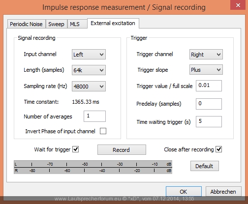 Slope ist die gewünschte Halbwelle, der Value der Schwellenwert, der vom Signal erreicht werden muss. Time wait Trigger ist eine "Abschaltfunktion" - ARTA wartet bis zum Ablauf dieser Zeit auf ein Triggersignal, wenn nichts kommt wird automatisch eine Messung durchgeführt.