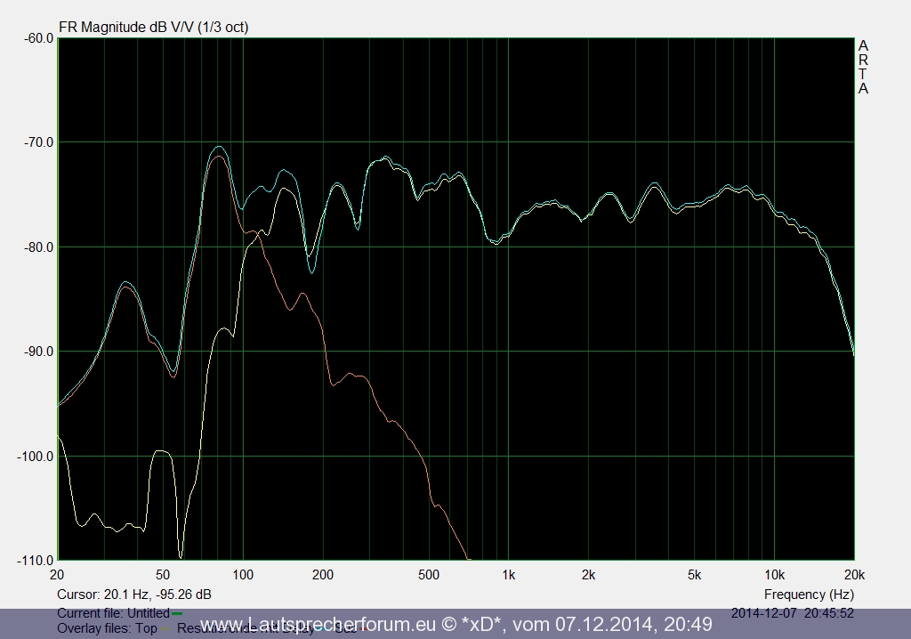 Keine Sorge der Sub macht schon mehr tief als das was gemessen wird - da ist der Raum schuld. Generell gefällt mir die Miniaturkiste bisher sehr gut (Faital 15FH500 in 85L / 48Hz). Das Setup des Tops ist noch nicht optimal, muss ich nochmal draußen vermessen - die Bodenreflektion wird dann gleich mit berücksichtigt im Setup.
