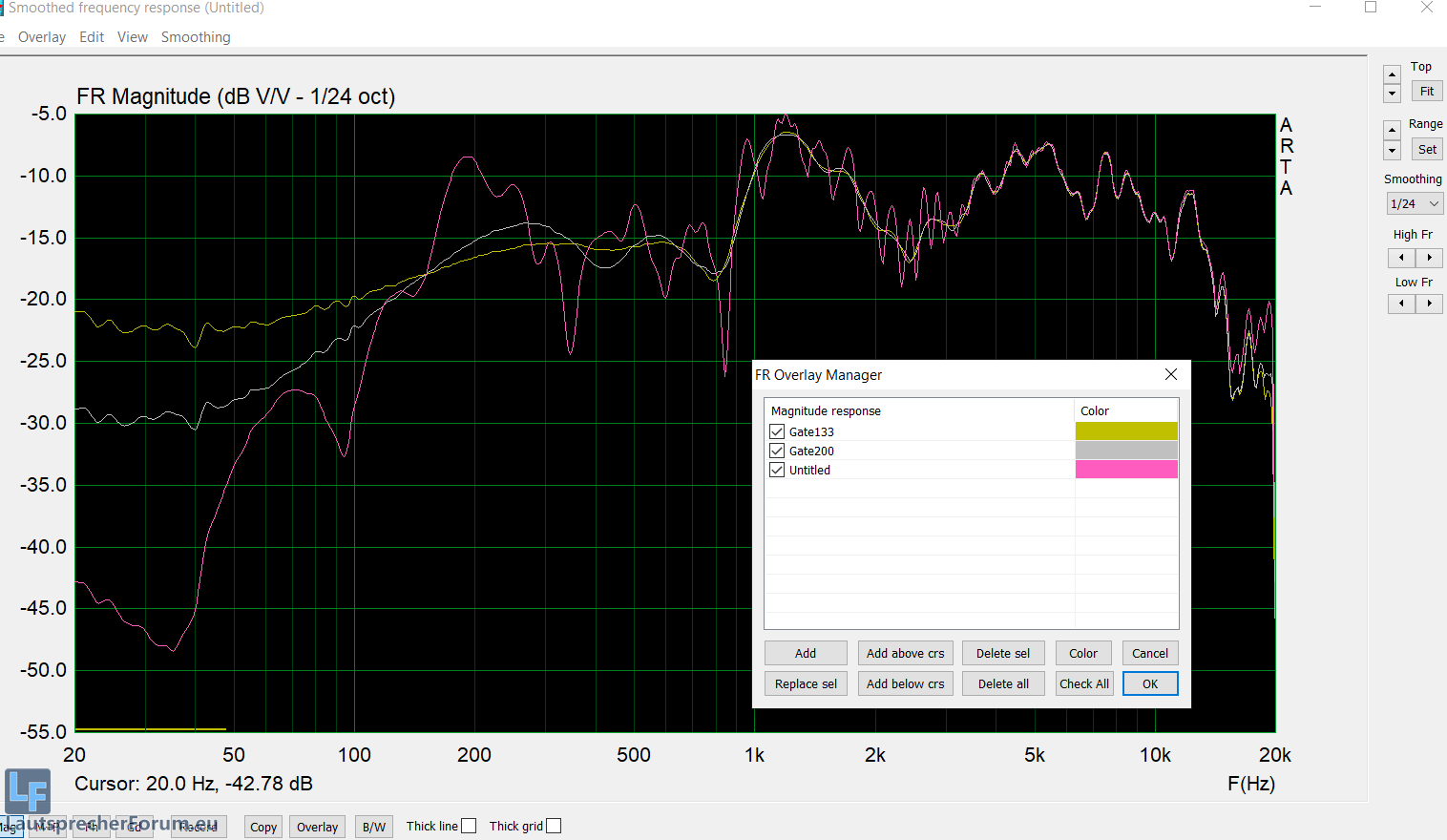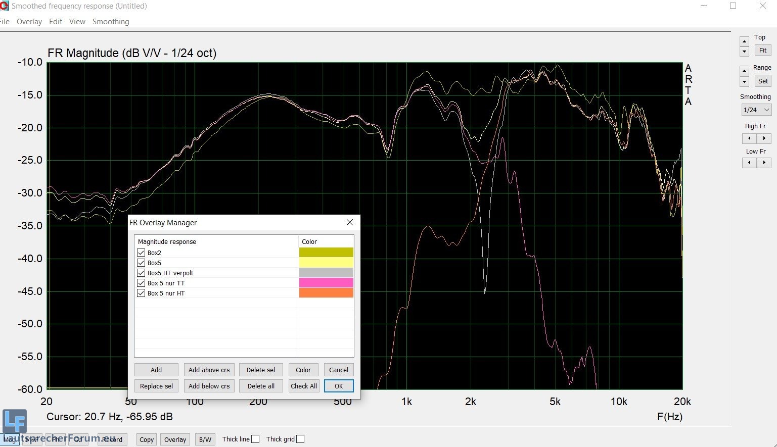 Falls du Interesse dran hast, mache mal das Gitter ab -> Messung. Dann nur den Hochtöner, dann nur den Tieftöner, dann den HF invertieren.