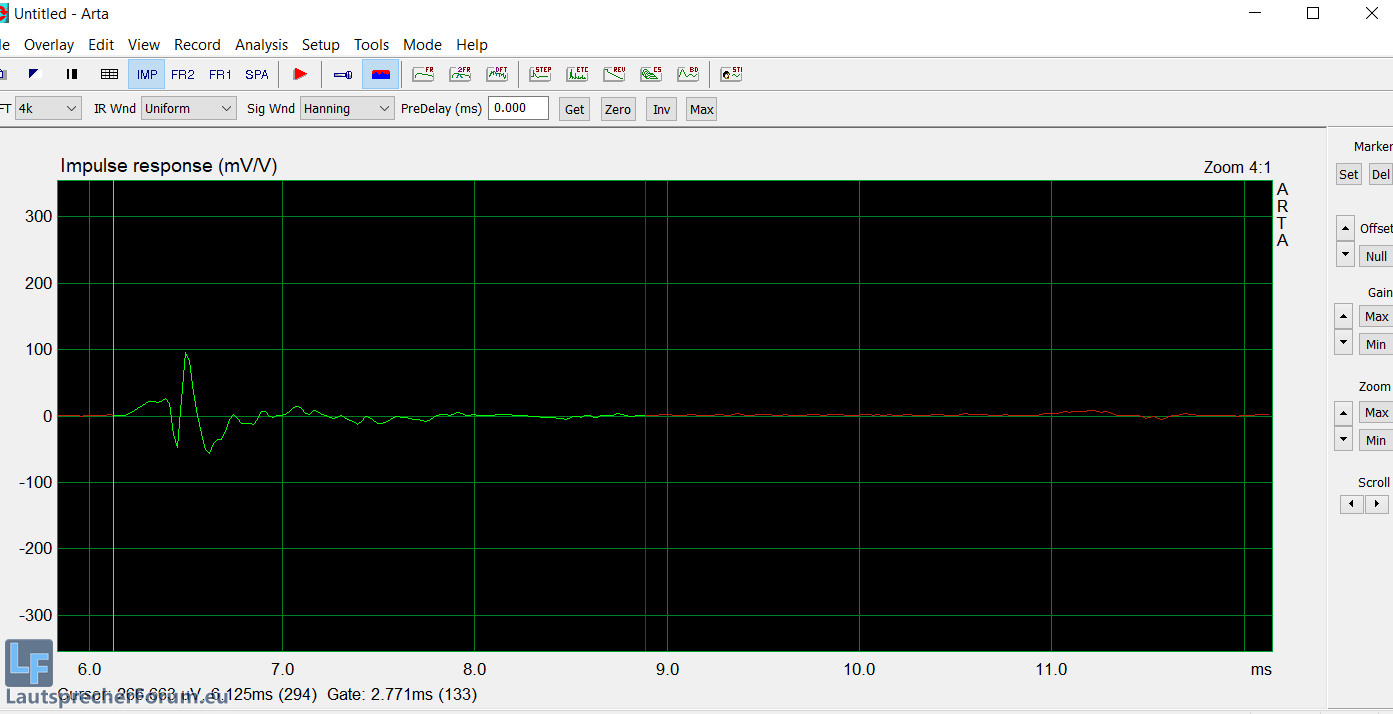 Heute hatte ich mal wieder Zeit für das Thema. Wieder dieselbe Hardware, Mikro in 2,15 m Abstand und in 1,98 m Höhe -> Gatelänge 6,542 ms eingestellt.
