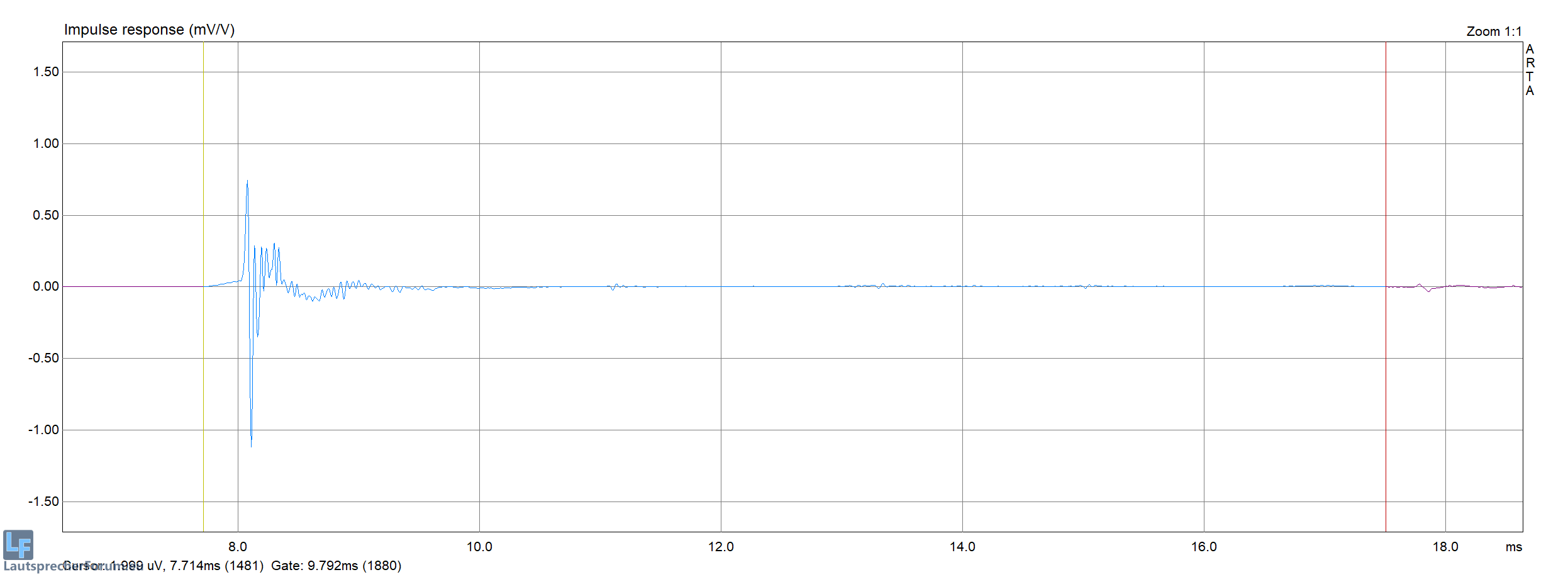 Jetzt habe ich nochmal gemessen, diesmal mit dem UCA202 direkt an der Endstufe. Das Mikro war auf 193 cm Höhe, der Abstand zum Lautsprecher 1,30 Meter. Damit habe ich eine Gatelänge von gut 8 ms ausgerechnet und 7,5 ms eingestellt. Hier das Messergebnis für die beiden Lautsprecher: