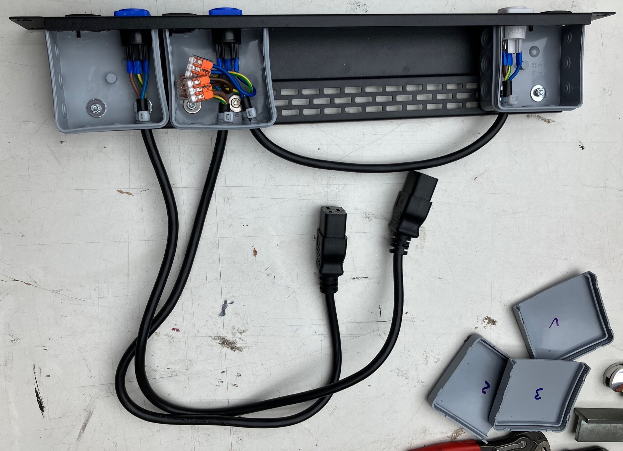 Ich bin letztendlich bei den Caymon Panels mit Möglichkeit der Zugentlastung gelandet - ich verwende die 106T, 108T und 112T Typen. Auf dem Fotos die Verwendung als Patchpanel für 4 Kanäle (XLR in / Speakon out) und Stromversorgung für zwei Endstufen und Powercon out. Auf dem Bild fehlt noch die Verbindung des Schutzleiters mit dem Panel, das habe ich inzwischen noch ergänzt - und ja, ich weiß dass das nicht regelungskonform ist, mir ist es bei einem Fest-Einbau im Rack sicher genug.