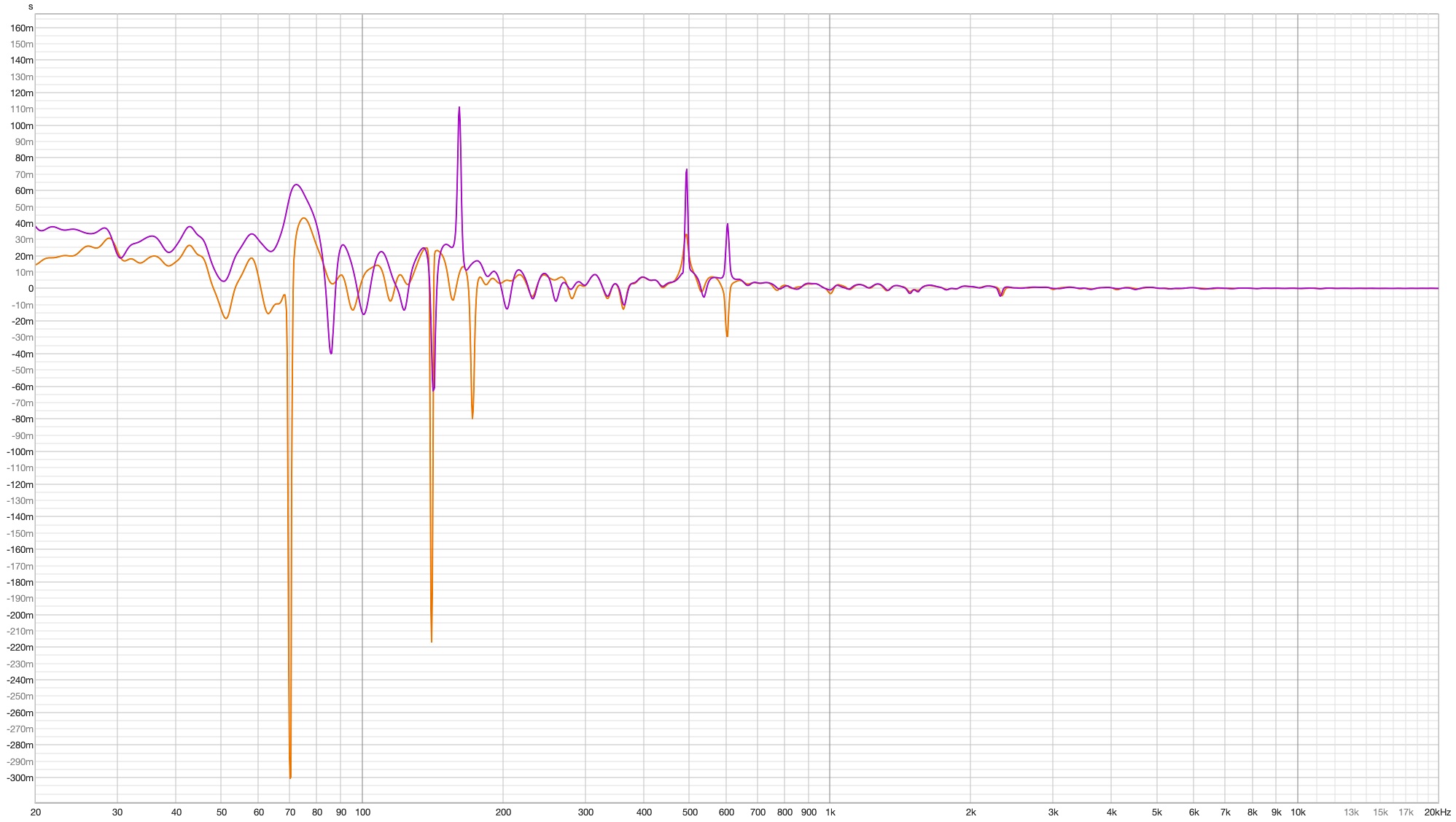 Man sieht deutlich, dass du Links ohne Subs zwischen 40 und 80 Hz deutlich mehr Energie hast, was mit den Subs deutlich gleichmäßiger ist (aber sehr leise, wenn das Bass fehlt, würde ich mal 5db auf die Subs raufpacken). Auch rechts sehr deutlich, wenngleich auch hier ungleich zu Links - das passt zur Vermutung zum GD oben - die Subs stehen unterschiedlich, richtig? Zumindest hast du im Bereich 70-80 Hz auf der rechten Seite eine Verzögerung, die eine Seitenreflektion sein könnte (weil links weniger deutlich), für den linken Kanal gilt das zwischen 80 und 90 Hz. Einmal im GD zu sehen und noch deutlicher im Spectogramm. Ich tendiere eher zu Reflexion als Mode, weil du zwar die Zeitverzögerung hast, aber im Specto an der Stelle keinen Energiepeak (sieht tendenziell eher nach ner Auslöschung aus).